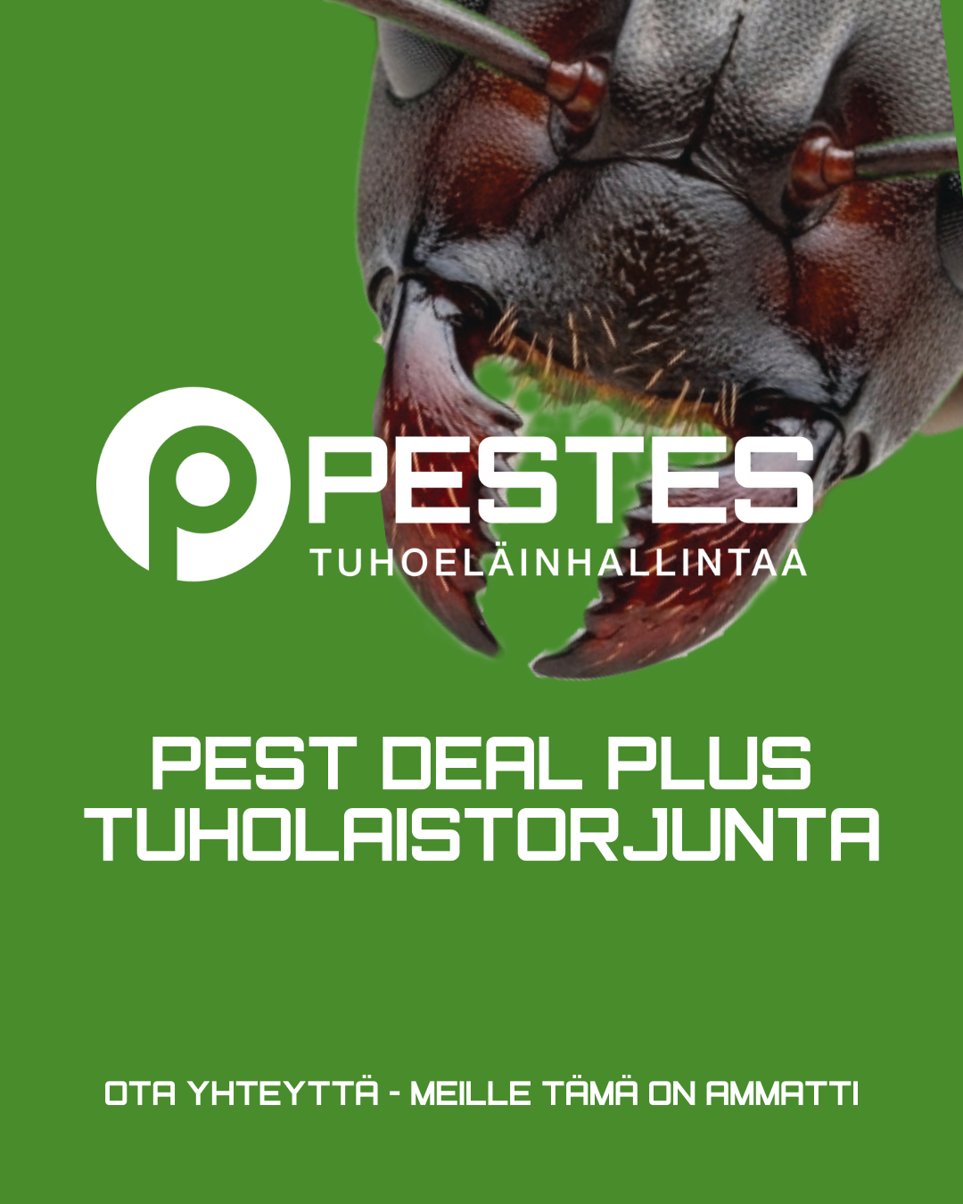 Nykyaikainen kiinteistönhuolto on muutakin, kuin seinien ja kattojen ylläpitoa - se on asumisviihtyvyyden varmistamista. Jos koti ei ole tuholaisvapaa, ei siellä voi viihtyä. Pest Deal PLUS on kehitetty juuri tähän huoleen. Edistyksellinen palvelukokonaisuus, jolla henkilökohtainen palvelu ja kustannusten ennakoitavuus yhdistyvät ja tuholaiset pysyvät poissa.